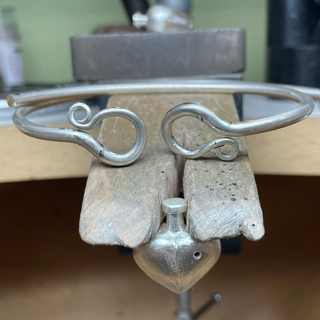 To the next stage of cleaning them up, backing them with Silver sheet and attaching to the main forged bangles using a chunky 9ct Rose Gold jump ring, adding a Rose Gold setting.