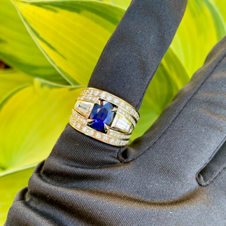 We decided to add tapered Diamond baguettes to a spectacular new Sapphire and flank these as before with a Daimond encrusted double split shank.